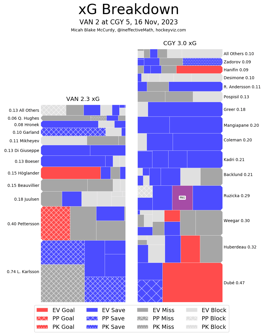 (Stats compiled from Naturalstattrick.com // Game Score from Hockeystatcards.com // xG and Under Pressure charts from HockeyViz.com // Game Flow and Shot Heatmap from NaturalStatTrick.com)
