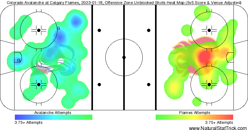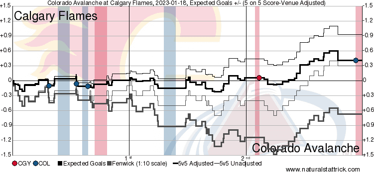 Taken By Chance – The Avalanche did not get a ton of high danger looks against – but when they did, they were massively noticeable. Jonathan Huberdeau (72.31 SCF% // 100 HDCF%) was amongst the 6 Flames players that didn’t see a high danger look against, and of those 6 he was involved in the most raw HDCF. For the whole game that honour belongs to Kadri (70.19% // 70.04%) with over 5 for. Ever since he got that All-Star nomination he’s been back to looking like early season player that could impact every game – Calgary’s desperately searching for one of those to step up so they can go on a mini-run.
