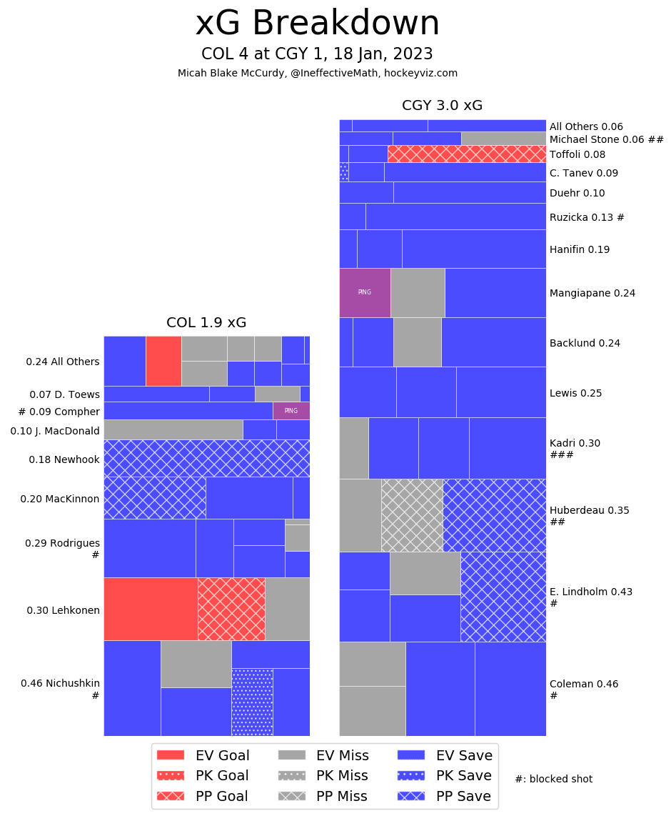 Corsi Clown – Michael Stone (35.71%) and partner Nikita Zadorov (42.42%) ended up on the bad side of some penalties in this one. Them and the Backlund (42.16%), Mangiapane (37.84%), Coleman (36.00%) trio got buried a bit. The one thing I dislike about the new lines was these three got broke up. For the first time though Mangiapane had a new centre in Kadri (46.53%) but still had Coleman on the other wing. Interesting to see what can happen there.