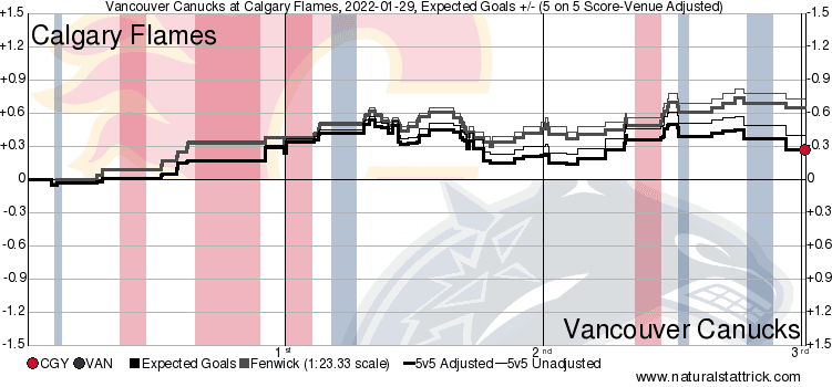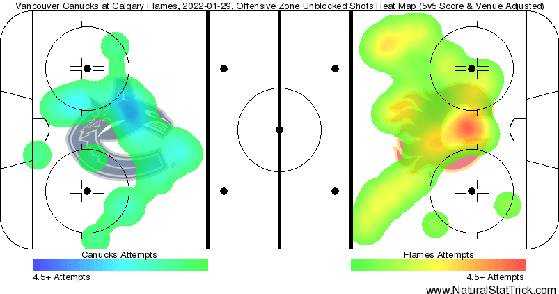 In The Crease – 1.13 expected goals against – that number was only 0.12 higher than Columbus got in their beatdown the Flames gave them. Not much from offence for Vancouver, but what little they did muster former Canuck Markstrom was up to the task. 7 Shutouts at the half mark, only 3 of legend Miikka Kiprusoff’s team record. Markstrom can certainly put himself into Flames record books for a long time should he accomplish that feat.