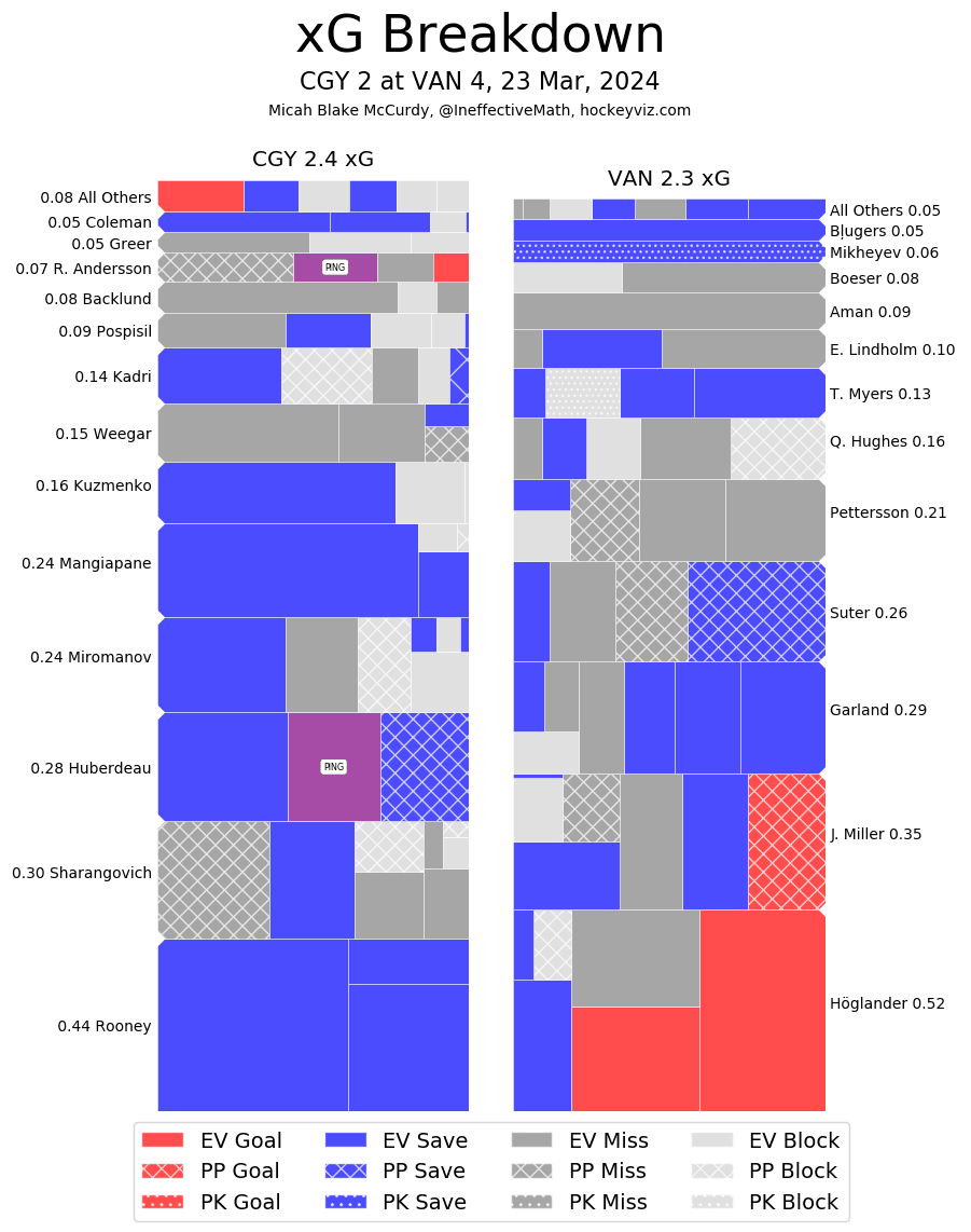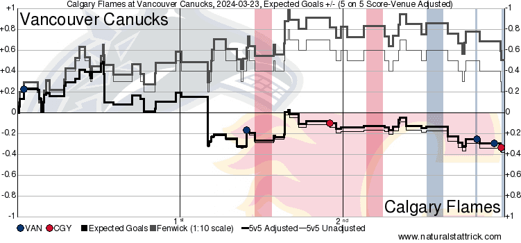 In The Crease – Markstrom returned with a more than acceptable performance after some time off. The first goal scored by the Canucks was crisp – so crisp it usually takes 10 minutes of play before a team breaks that out. The Canucks were ready to go off the jump and have been all year – Rick Tocchet is the coach of the year, no question. Markstrom did his best, but the defence in front of him wasn’t what he’s been used to this season. 2 goals against on 1.91 expected goals against at 5v5.