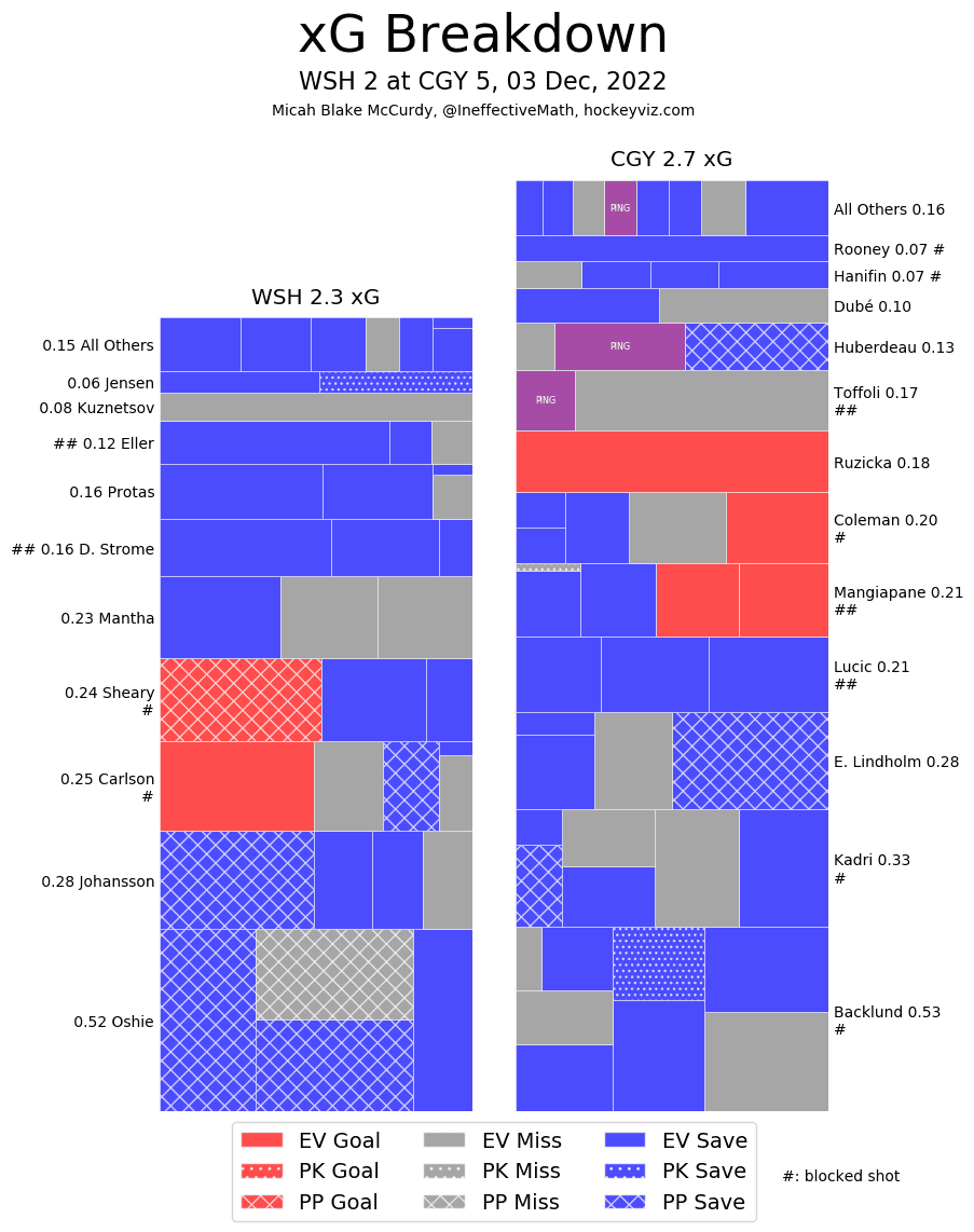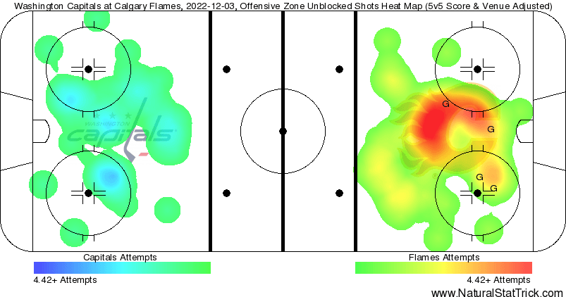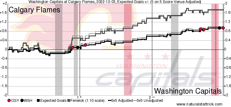 It’s a Team Game – Huge compliments to Calgary who stepped on the gas in the second period – got the lead they were looking for – then proceeded to lock things up in the third period. Not that they had an overabundance of anything themselves in the third frame (well, maybe goals) but the Capitals were limited to no high danger 5v5 opportunities. Calgary didn’t overwhelm the Caps any given one time rather they kept up a steady attack all night long. In order to do that their transitions through the neutral zone as well as their forechecking had to be operating successfully all night long. Strong fundamentals from Calgary.