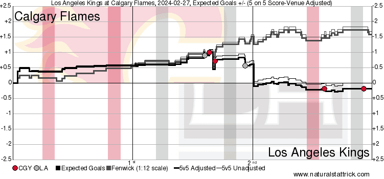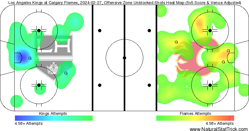 In The Crease – Another day and another quality start for Jacob Markstrom. The man might single-handedly drag the Calgary Flames into the Stanley Cup playoffs if he just plays like this every single night out. The Kings even caught him off guard because they barely shot the puck for the first half of the match, but after the first goal Markstrom settled back in to being the dialed in machine we’ve seen since the seasons tarted. 2.18 expected goals against at 5v5 with just 2 getting behind him.