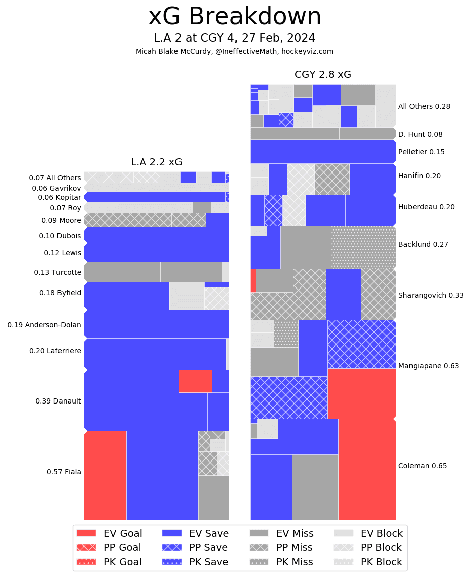 Taken By Chance – Blake Coleman (66.85 SCF% // 84.71 HDCF%) led the team in high danger chances with 6. He backed it up with just 1 against – the Backlund (66.96% // 82.17%) trio spent almost the entire time attacking in this one. On the flip side the Kings got some quality looks, in the third period specifically, that were given up against the usual suspects. Andersson (23.53% // 15.08%) and Weegar (17.02% // 15.08%) do play top minutes against top players, but the end results can’t be this many quality looks against in a game. For what it’s worth I still feel Weegar had a good game – he just lost some of that finishing touch on his shots the last little bit.