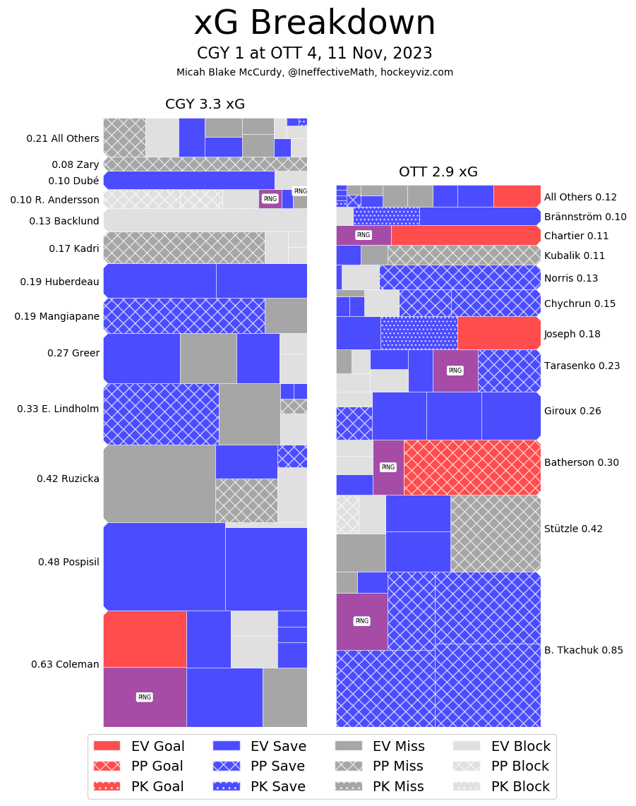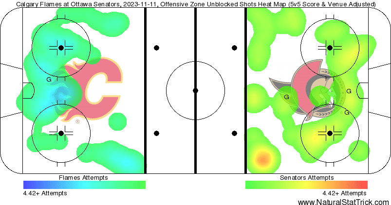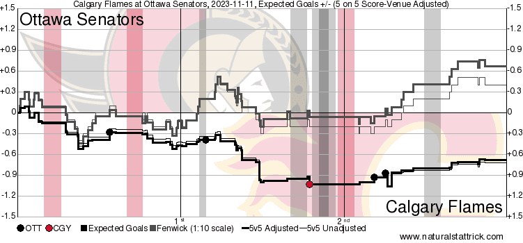 In The Crease – Am I going to attempt to justify every single one of the goals scored against Dustin Wolf? Yes. Joseph goal was one of the nastiest tips – great coverage by the defenceman to not touch Joseph at all. Batherson’s goal was on the power play and we don’t blame goaltenders for going down a man. The Chartier goal is completely on Nikita Zadorov for his play behind the net, then Desimone overcorrects and covers the guy the center should have – lead to a tap in. Hamonic’s goal… Wolf should want that one back. All together he did a real good job, almost got back to a .900 save percentage because the Flames leaked so many shots through. He looked fundamentally sound and none of the goals seemed to rattle him. Just another day at work. 1.31 expected goals against with 1 high danger and 2 medium danger 5v5 goals against.