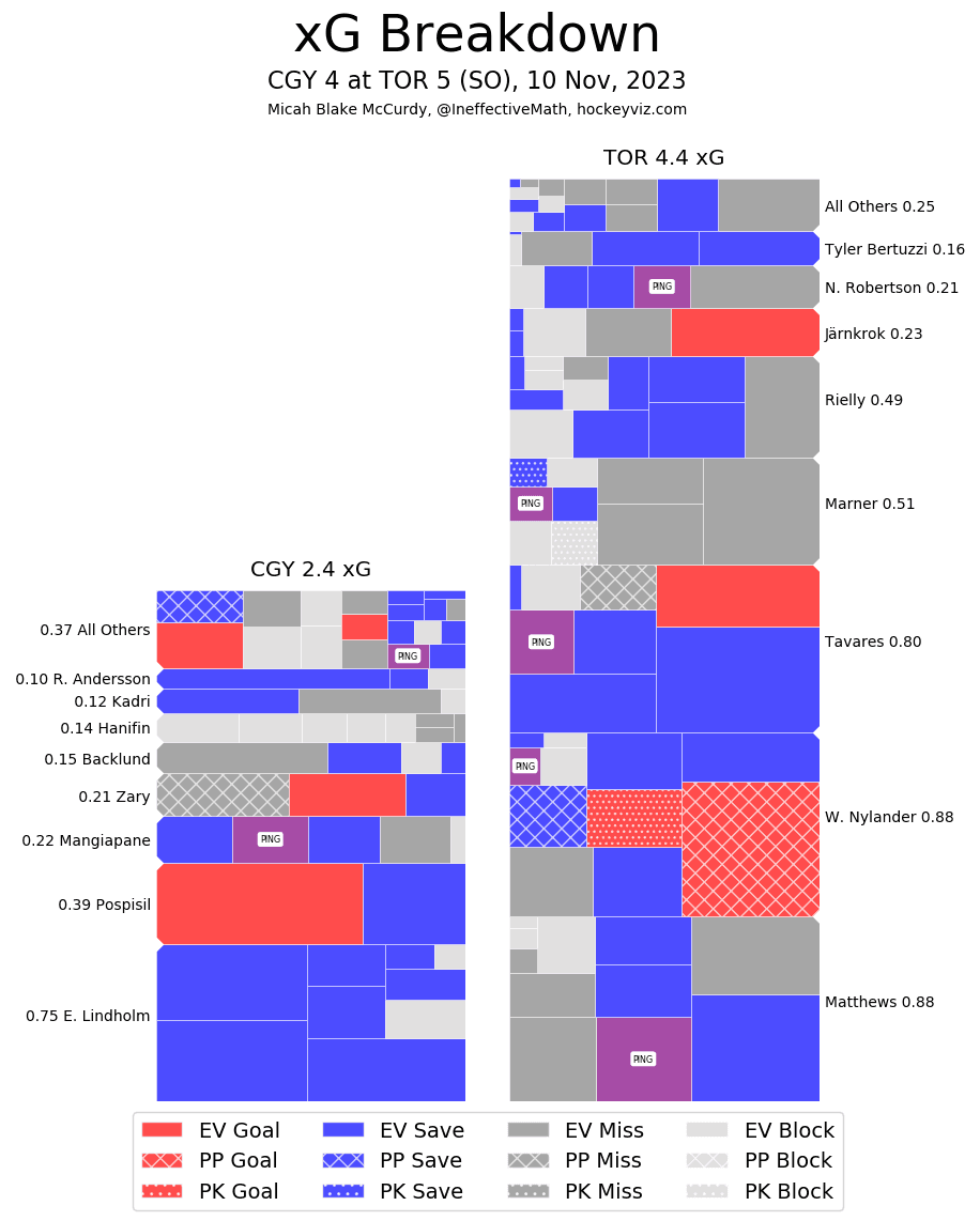 In The Crease – 2.83 expected goals against with only two 5v5 goals getting behind him. If it weren’t for him this could have been a blowout on home ice for Toronto. The only goals to beat him were of the high danger variety too – no major weak ones. He probably wants the second one back, but the defenders in front of the crease need to just be vastly improved. Vladar has had a lot of rough outings during his recent starts, this one was quality. That SOL point can be attributed largely to Vladar.