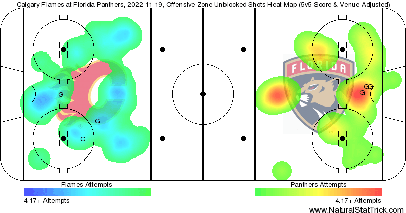 In The Crease – I’ll say one thing about Markstrom’s performance – all the 5v5 goals were classified as high danger. That’s right they’ll call them high danger right in front of the net whether the goaler is there or behind it. One could argue without him behind the net it’s an even higher danger chance but now I just feel like I’m being extra mean. 1.85 expected goals against 5v5 with 3 high danger chances get behind him. Still got the W though because Spencer Knight couldn’t stop much himself.