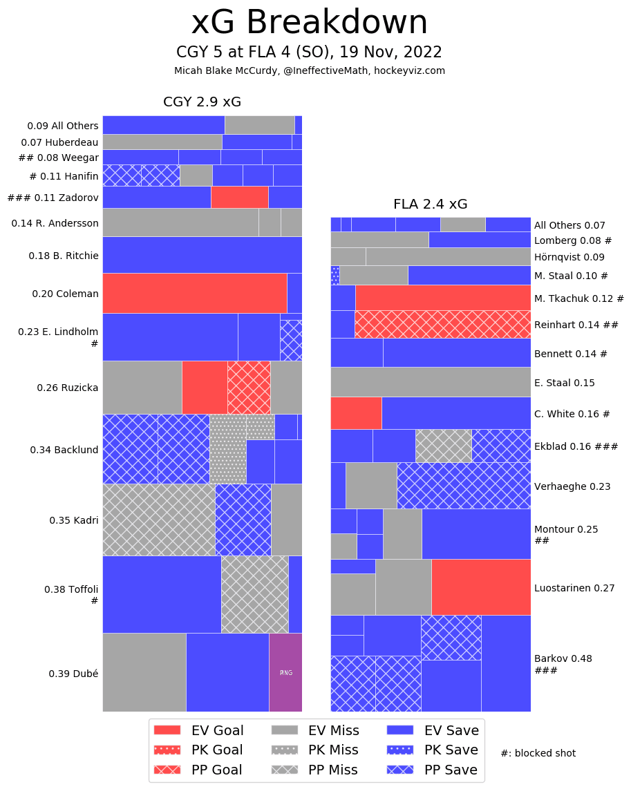 Corsi Clown – Rasmus Andersson (30.51%) and Noah Hanifin (36.79%) got on the bad side of both attempts against and quality against. A major part of that comes from playing hard minutes against a very talented trailing team that knows how to ramp up their pressure. While not the single most flattering performance they did not get scored on 5v5. Nazem Kadri (43.58%) was the lowest forward – even then 44% isn’t terrible.