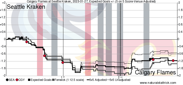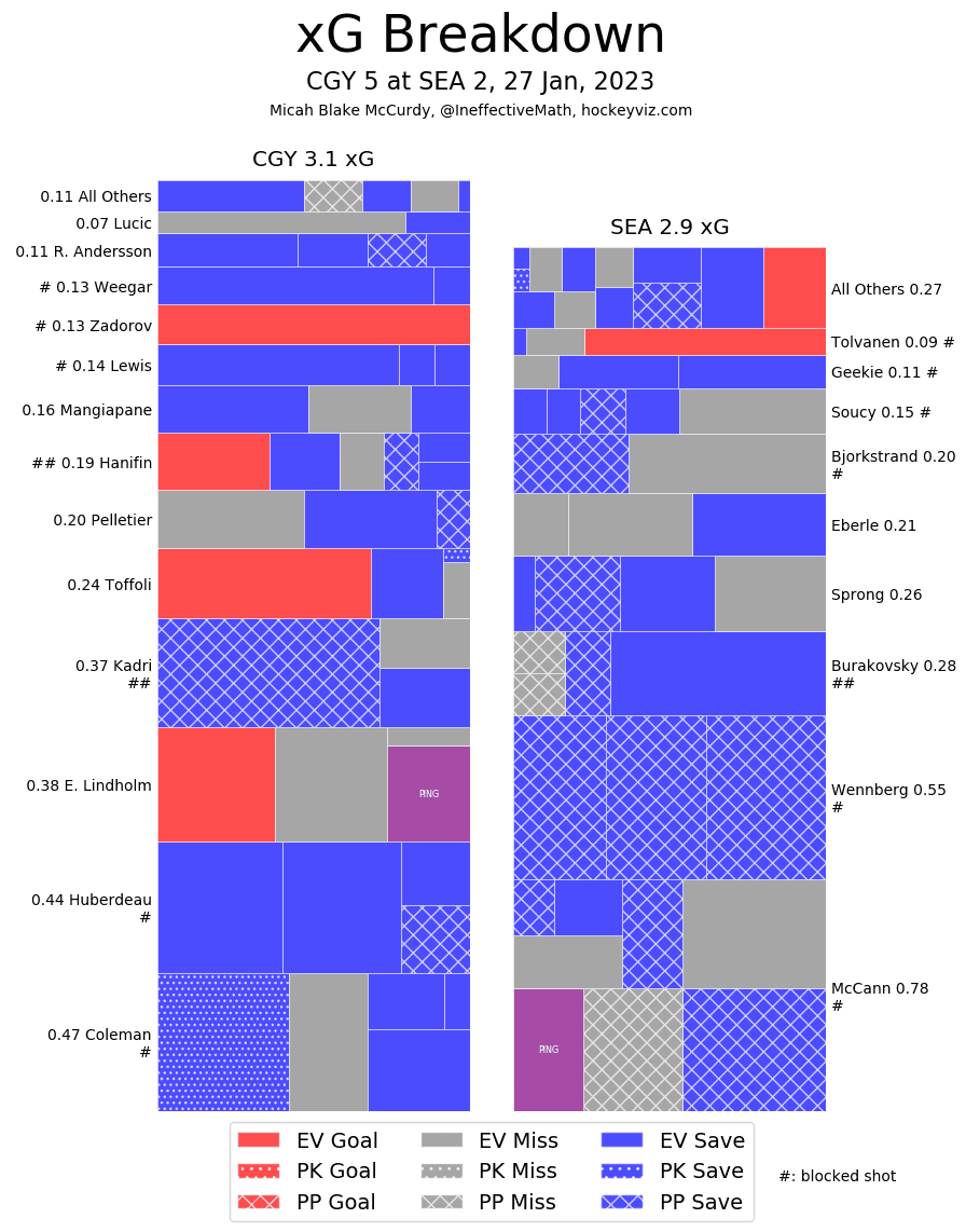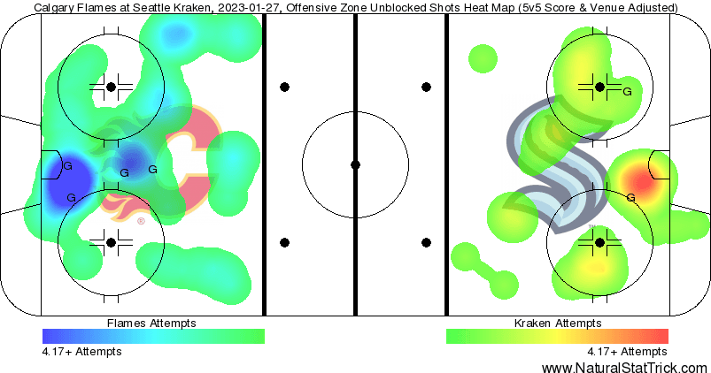 Corsi King – Mikael Backlund (77.60%) lead the way with his linemates right there with him – Coleman (74.15%) and Mangiapane (71.98%). The Kraken defence struggled mightily with the Flames board play tonight, Calgary constantly kept possession. Stone (75.21%) and Gilbert (69% – nice) kept things simple and it paid off for them. The massive help for everyone was the back-checking and neutral zone play. I can’t state enough how much Pelletier (64.83%) has already stood out every single game in that regard. He’s always back defensively when it’s his job and he’s picked off a few pucks for quick counterstrikes too. Same stuff Backlund/Coleman/Mangiapane do nightly.