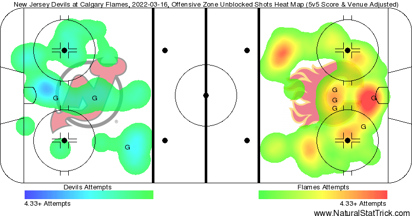 Corsi King – Oliver Kylington (77.18 CF%) makes the Flames better when he plays. Kylington getting hurt again would take a massive amount of mobility of their back end. Tyler Toffoli (75.51%) hardly saw any pucks go towards Markstrom yet was out there for 2-goals against. That Subban goal was a rare one for Calgary to give up – those don’t happen often in Calgary these days. Elias Lindholm (69.79%) and company were up there in attempts as well.