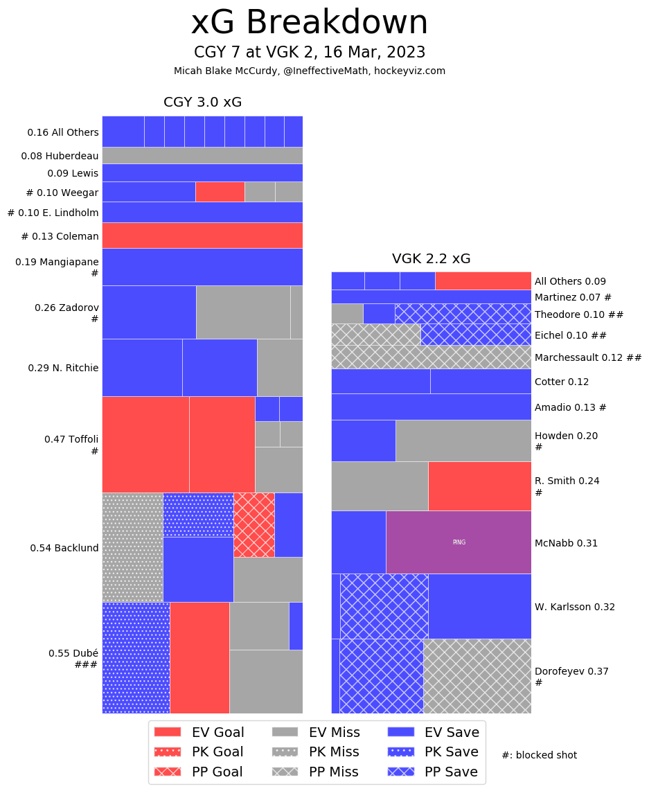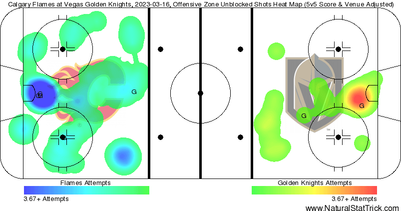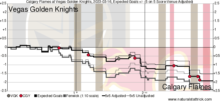 It’s a Team Game – All three periods leaned in the favour of the Flames. The Golden Knights faded away as the game went on and really mailed the third period in. Vegas only mustered up 5 scoring chances in their best period, shot attempts maxed out at 13 in the second period, and after the Flames’ third goal did nothing but suffer. Jonathan Quick fell off his early Vegas heater and Markstrom stayed on his current one giving Calgary the time to eventually let the offence take hold.