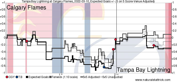 xGF% – Tyler Toffoli (24.35 xGF%), Blake Coleman (27.91%), and Adam Ružička (28.09%) were personally victimized by the Tampa team in the second period. Spent a lot of shifts getting hemmed in their own zone – but they never gave up a goal. Nice bounce back in quality share for Chris Tanev (60.98%) and Oliver Kylington (60.90%) – the latter of which looked more comfortable tonight after a string of games where his skates seemed to move faster than his hands at times.