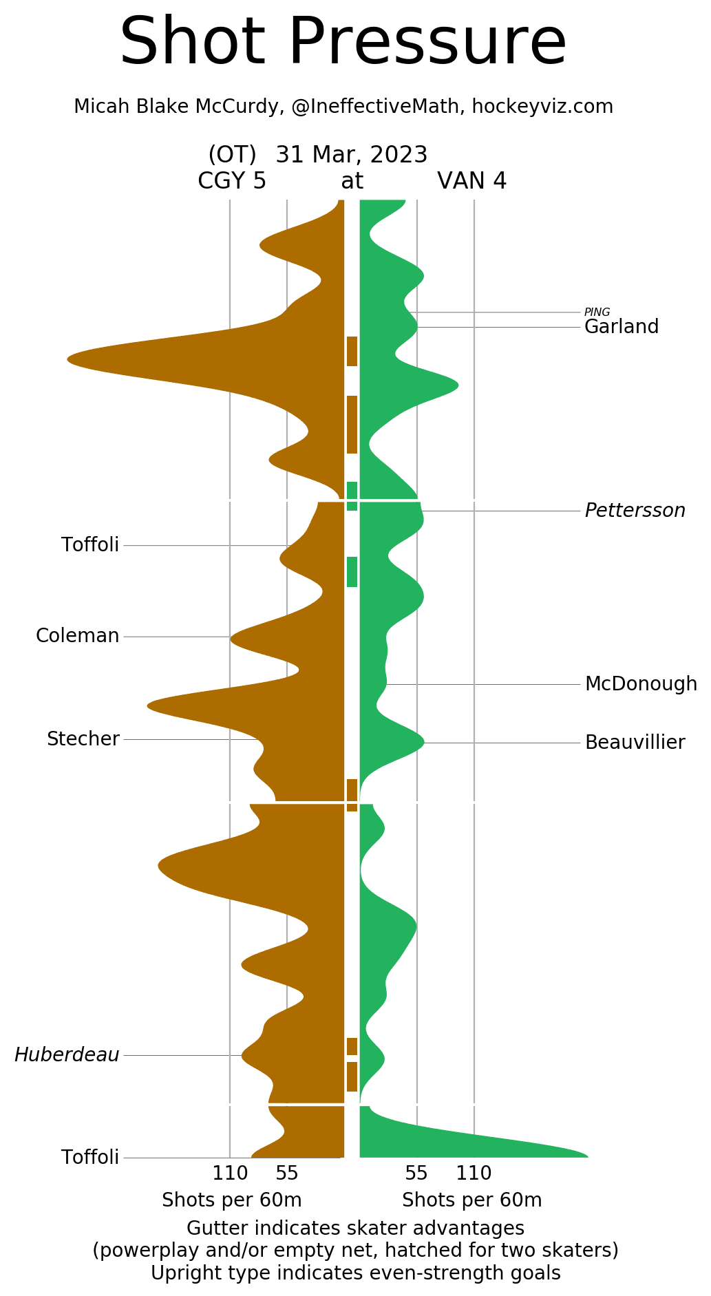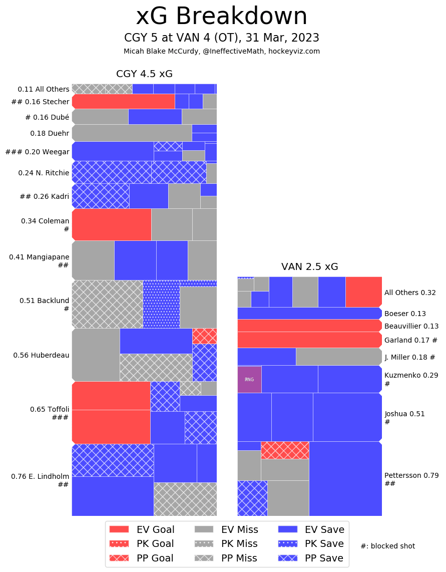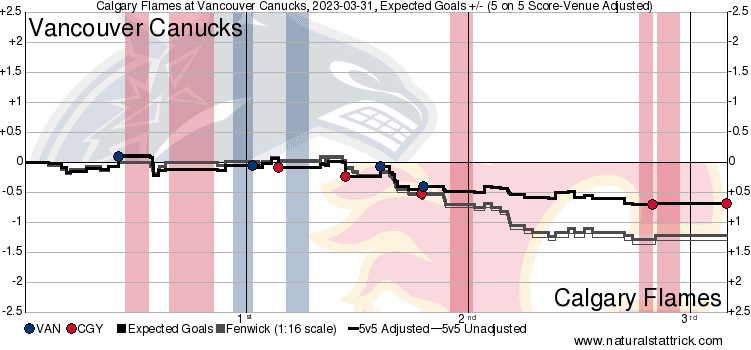 xGF% – MacKenzie Weegar (90.96%) was a beast. Lindholm (79.25%) was the next closest Flame after a huge night for him and his line with Mangiapane (77.93%) and the game hero Toffoli (78.09%). Lindholm stood out for me while watching – he was taking fantastic shot attempts all night, but Demko had his number. I also like to see Coleman (53.56%) hit 18 goals as someone who pretty much just gets third line minutes. That’s valuable depth scoring wrapped up in a tremendous defensive minded forechecker.