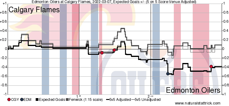 xGF% – When the raw totals for overall chances are this low, I like to look for strange anomalies. The two players with the highest raw totals of xGA were Nikita Zadorov (30.09 xGF%) and Erik Gudbranson (28.16%). I mention them because I don’t believe they played bad at all, but the Oilers played some strong enough defence that the numbers get over skewed by lack of data. One game samples are more for one-off observations, multiple games strung together are more useful to aid in analyzing. Both teams came out and played a well-structured defensive game (yes, I’m crediting the Oilers there), but the Flames have been doing that for longer and with a deeper roster in regards to their depth lines. If Jay Woodcroft ever gets some quality depth pieces, he could whip Edmonton into shape – lots of defensive potential in that young Markus Niemelainen. Calgary pounced on the few mistakes the Oilers made and earn the two points.
