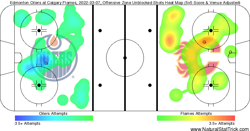I think this is the saddest Flames heatmap I’ve seen all season and they won this game. You can’t beat the Oilers in a track meet game when they have McDavid – if they wanted to win they had to give up as little as possible. It helps when the opposing coach is trying to teach his team to play a similar style but they aren’t familiar with it completely yet. Anyways I’m very interested to see if the Flames can crease crash Washington Tuesday and try and expose their young goaltenders.