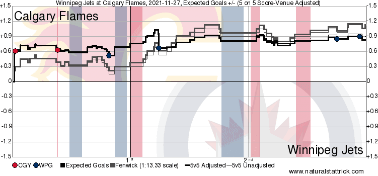 The Jets really only had three slight pushbacks towards the Flames constant build of momentum, and they scored on two of them. For the most part play was dictated 5v5 by the Flames and this one should’ve been theirs to win, but it doesn’t always happen that way in hockey.