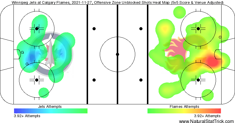 Calgary got chances from in tight on the crease like they normally do, but only on the right side of the net. Uncommon for them to not have the entire goalmouth surround with volume and instead just two-thirds of the net. They also – when they allowed chances – allowed them from the middle of the ice tonight. Winnipeg made a priority out of charging the net front after losing 5 in a row and it paid off for them getting some bounces falling their way.