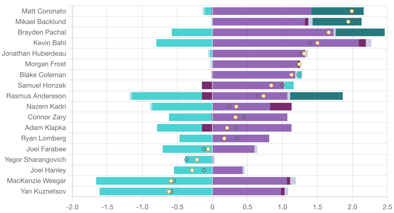 Corsi King – Brayden Pachal (72.74 CF%) with just six shot attempts against him and no goals. There is a lot of discussion about the forwards in this market and their lack of ability to produce, but I think a little attention also needs directed towards the back end. Rasmus Andersson (54.49 per cent) has been great to start the year, but he’s almost certainly going to be moving on in the year future. MacKenzie Weegar (57.84 per cent) would be next in line for offence, but has been struggling with consistency and has just 4 assists on the season. The other two regulars aren’t exactly known for how much they aid the offence – Kevin Bahl (47.47 per cent) and Joel Hanley (61.73 per cent). Throw in the rest of the party with Jake Bean, Daniil Miromanov, and Zayne Parekh and who exactly is helping move the puck from the backend? I do think the defence needs to take some blame for the lack of offence. Too many default, low-percentage shots from the point and not enough of an ability to hold the line and keep an attack alive. There is nobody there to help out or make it better either. Yan Kuznetsov (58.71 per cent) has been really good, but even that’s not enough.