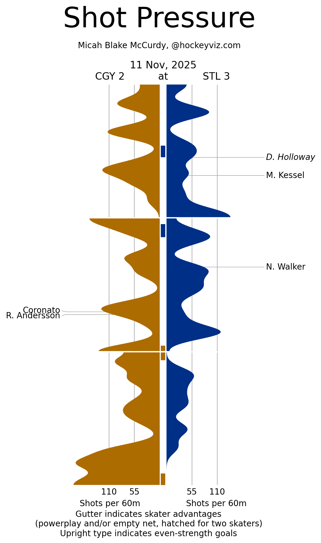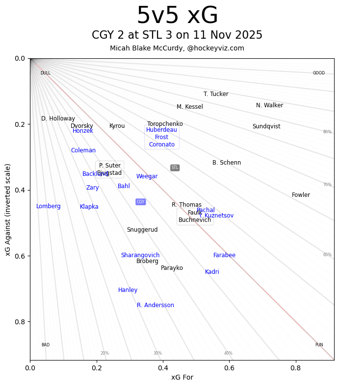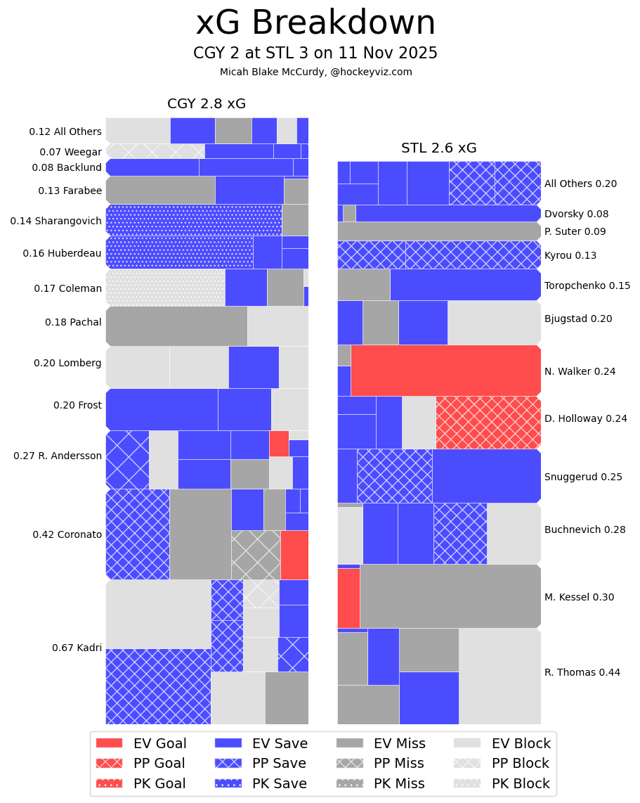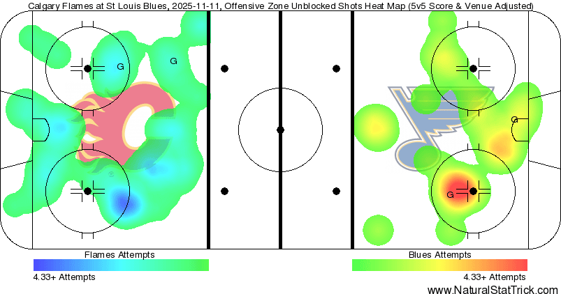 It’s a Team Game – Calgary once again controlled time of possession, but it did not do much for their ability to generate a significant amount of dangerous chances. If you gander at the shot heatmap below, you’ll see neither team really did a good job of getting into the blue paint. Nathan Walker got into the crease for the Blues second goal, but other than that nobody was getting a decent number of chances on the doorstep. I noticed Nazem Kadri early in the game – he was really trying to make moves into the middle of the ice – but it never did result in a quality shot. As the game progressed it was Matt Coronato once again leading the offensive charge. He’s been the main driver of chances the last three games, and it was good he was finally able to break the scoreless streak. It had reached almost 190 straight minutes of game action without beating a goaltender for a score. While Calgary’s defensive efforts and metrics would lead you to believe they are significantly better than their record the historic level of bad offence they have employed makes the 4-12-2 record seem more deserved.