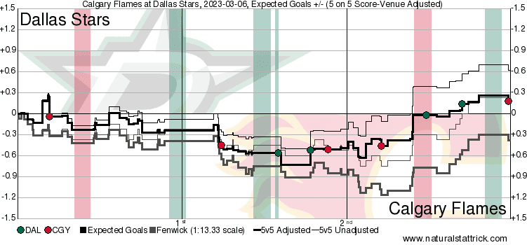 It’s a Team Game – A real tight matchup as an overall summary doesn’t paint the picture of how the game really went down. Calgary controlled the first 40 minutes pretty handily with high danger chances being 8-5 in their favour at 5v5. The third period alone saw Dallas outplay Calgary with a 7-1 high danger advantage. The Flames have played games this year with a full 60-minute effort that ended up as a loss and with the final 20 being an all Stars push this one ending up as it did was a surprise. With two third period collapses since January (Ottawa, Vegas) and this one coming close there is still lots to focus on when it comes to third period play with a lead.