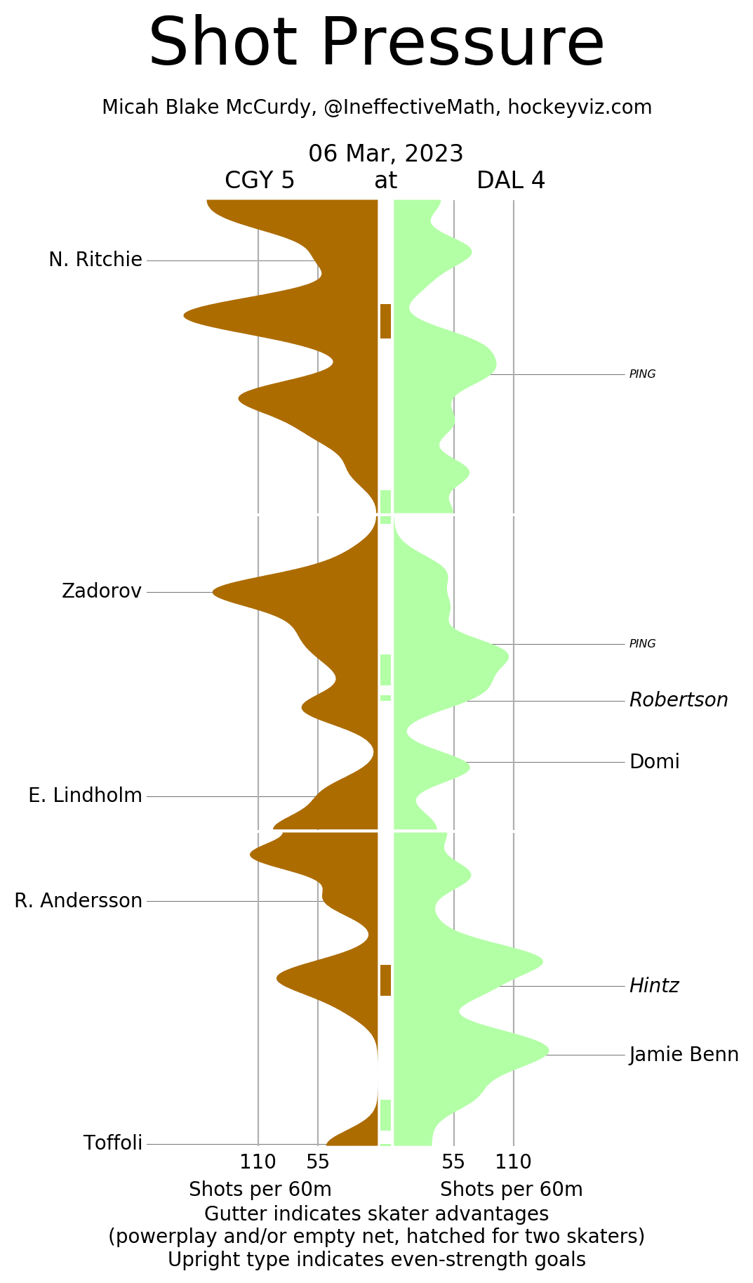 Corsi Clown – Milan Lucic (23.48%) and his season of struggles continues. I try to be nice to the guy but it really seems like he’s not amongst the 12 most effective Flames players on their roster. Duehr has won over not just the fans but the coach and GM – his emergence was cited by the GM as one of the reasons they could afford to move Brett Ritchie in their deadline deal. Ružička at his current age needs to be playing games to properly develop. Constantly sitting a 6’4” C/W combo at 23 years of age who has shown tremendous flashes of potential at times is a bad thing. Sitting him for players that aren’t bringing much to the table nightly makes it look worse. What’s wrong with a Dubé – Ružička – Duehr fourth line? He literally was not bringing a worse impact on any given night than the fourth line gave in this game. Youth is a good thing – the Flames really need to learn that embracing it can help. (See: Pelletier.)