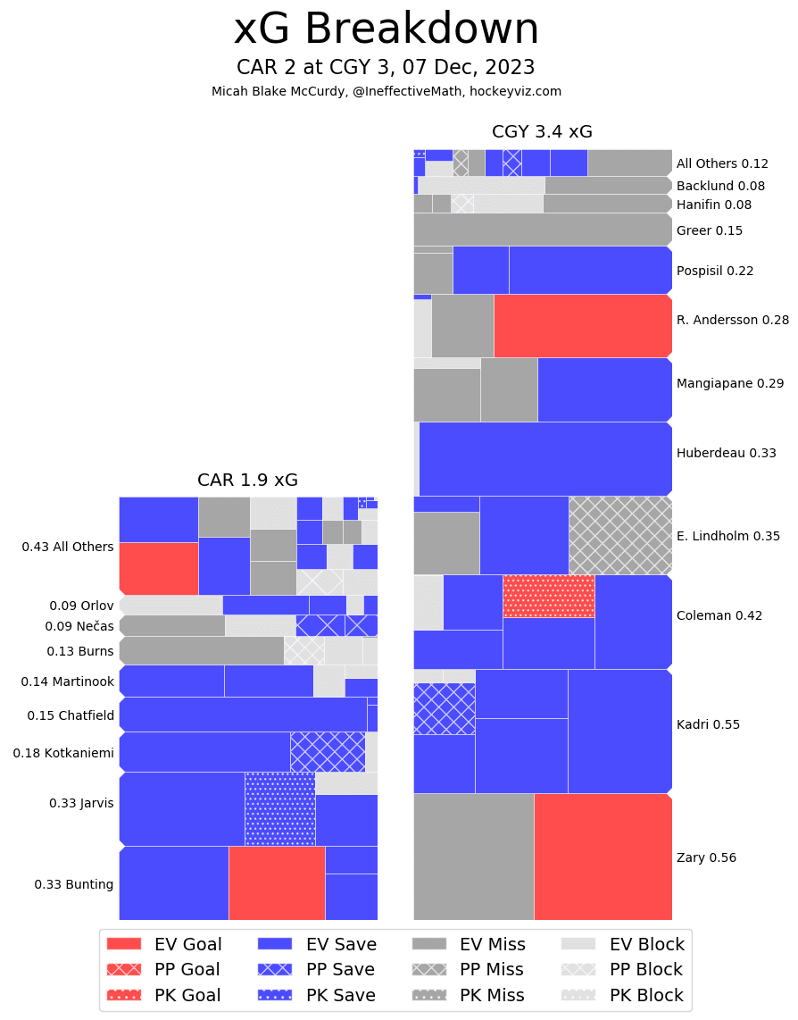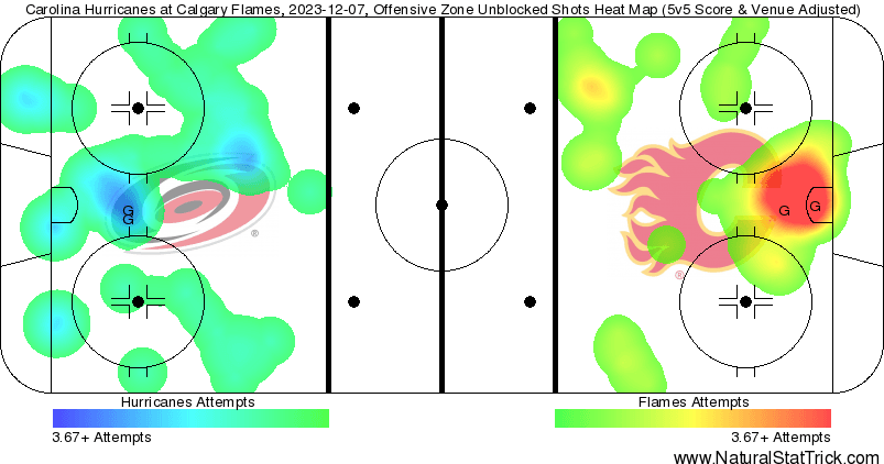 Corsi King – Noah Hanifin (54.79%) leads in an area most Flames will find themselves on the sub side of 50%. Carolina takes a lot of shot attempts, but they aren’t all dangerous. Calgary as a whole did a collective positive job in regards to winning the high danger battle. Blake Coleman (53.93%) did beat that in his minutes played as he continues to have a career year. That shorthanded goal after the little fake was gorgeous. Everyone that didn’t get their minutes cut short in the third I’d say had an alright game.
