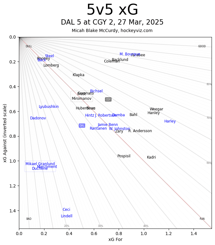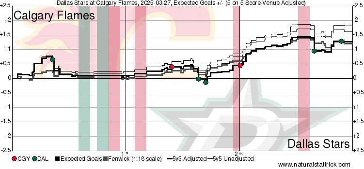 xGF% – Mikael Backlund (82.42 per cent) returned to tremendous results. Should have had an assist on the Blake Coleman (83.09 per cent) goal that was called back and was very effective on the forecheck. He had a long rough patch from the turn of the new year right up until his injury, hopefully he tended to his ailment and got enough rest to remain highly effective down the stretch. Unfortunate incident for Connor Zary (51.37 per cent) who had a Stars player accidentally slide into him from behind and he appeared to re-injure the knee he had just got back from rehabbing. It did not look good on the ice with Zary in visible pain – hoping the best for him.