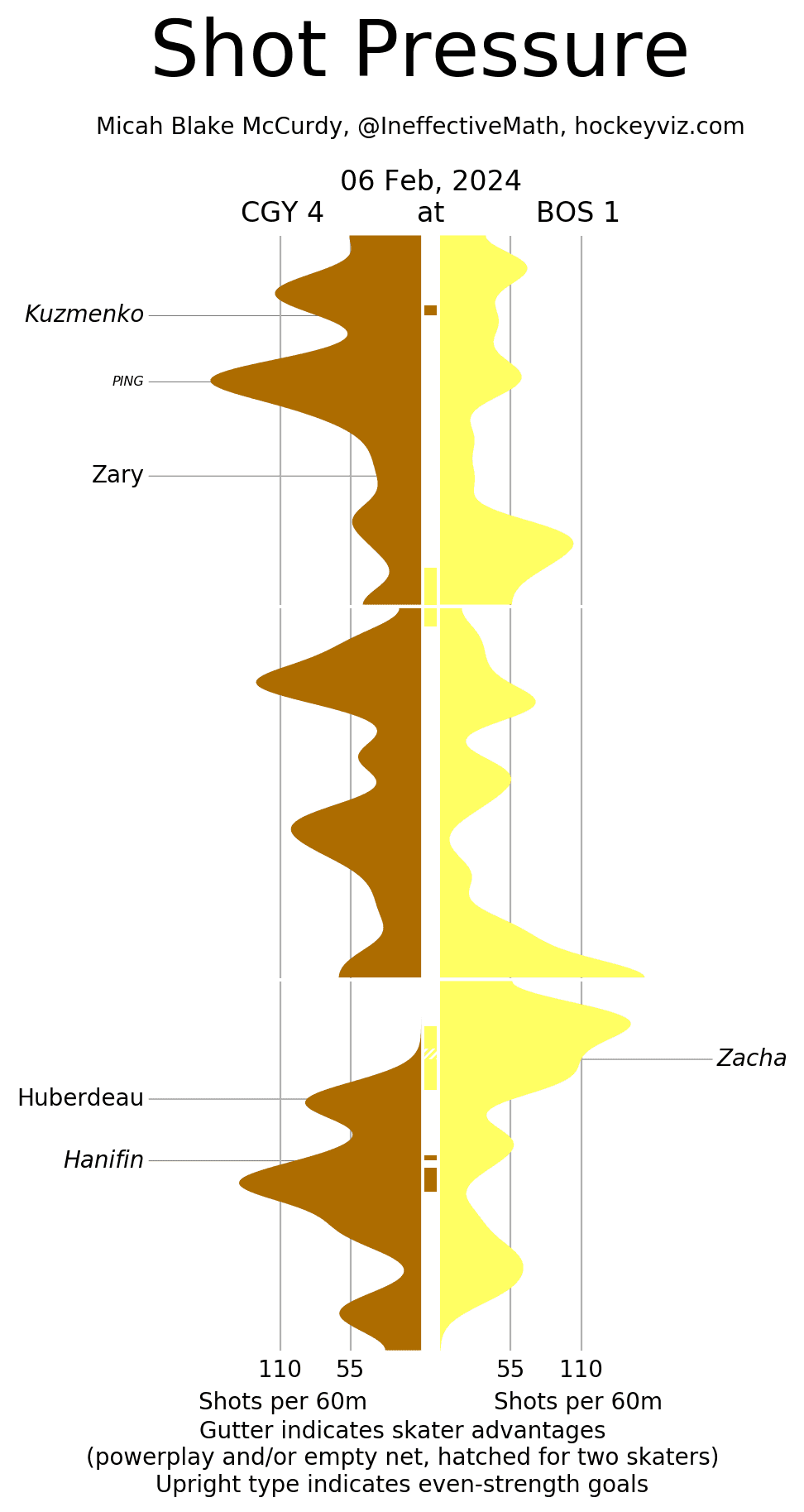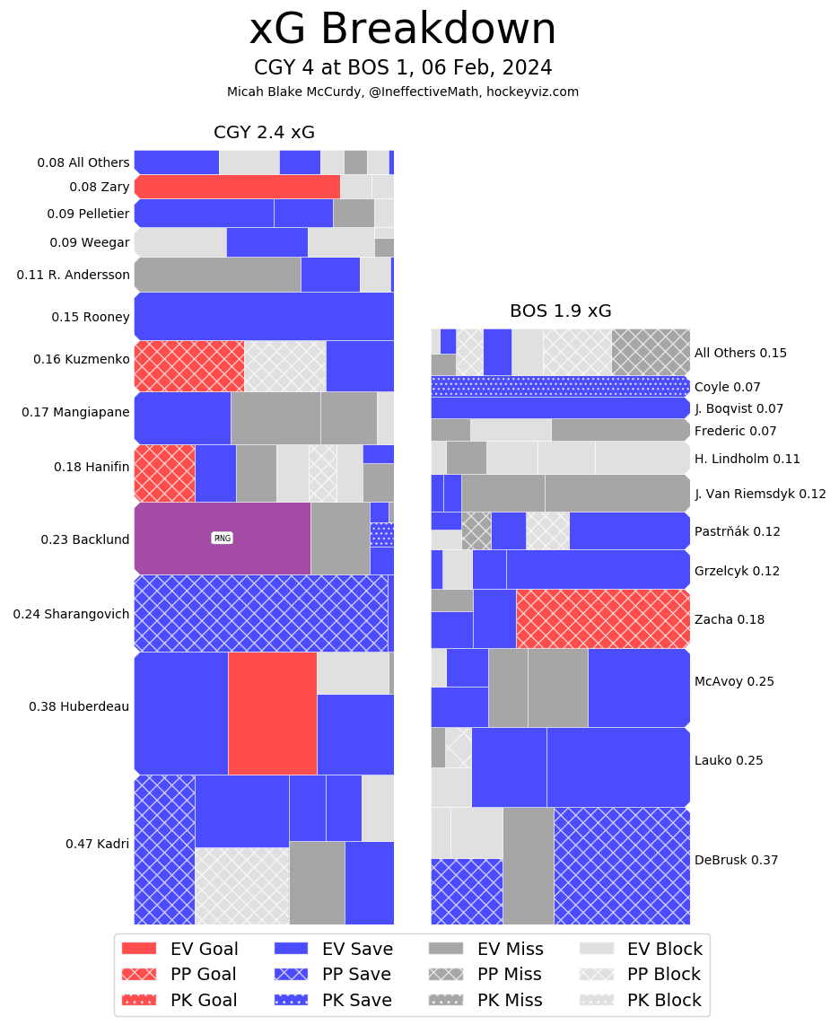 xGF% – Every single line had their positives to it with Hanifin (83.55%) leading the team. Let’s have a touch-in on the new guys. Pelletier (62.36%) got all that extra ice time after Pospisil (59.33%) was removed from the game, he absolutely crushed it. Kevin Rooney (50.42%) didn’t knock anybody’s socks off, but as I alluded to earlier was a welcome addition on the penalty kill. Brayden Pachal (52.34%) was a nice physical presence on the back end. Then there was Kuzmenko (66.52%) who is most certainly NOT Elias Lindholm. Kuzmenko was doing all sorts of creative things to get chances in tight in his minutes aided by his new partner Jonathan Huberdeau (59.72%). There was a ton of pre-game talk about how this line would fare with Sharangovich (61.73%) in the middle – Pinder described it as all gas, no brakes – but they did nothing close to sinking and instead swam rather well. It won’t be a one and done experiment, they have earned more runway together to see what happens.