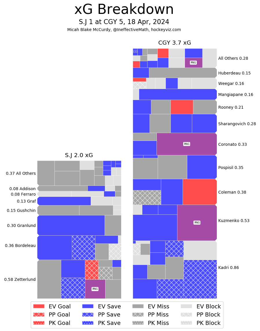 xGF% – It feels illegal for Kadri (80.79%) to have over a full expected goal in value only to be stonewalled by the Sharks. I would’ve liked to see Coronato (73.73%) get a bit more ice time but that will come in the form of the Wranglers playoffs starting soon. Wolf, Klapka (30.76%), Solovyov (48.34%) and Coronato will go back down and join the AHL squad as they quest for the Calder cup. It will be essential for the young man to keep the confidence rolling by trying to find some big-time goals in big time games.