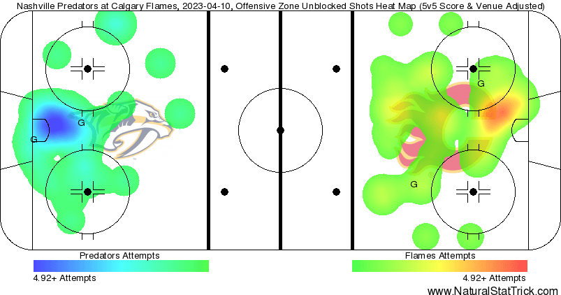 xGF% – I will point out Zadorov (50.74%) led for defenceman and was on the positive side. Huberdeau (78.08%) and his trio led the way for the entire team, but outside of them Zadorov ranked 4th. Nashville got the significantly better quality of 5v5 chances. The amount Calgary were taking was significant but the Preds did a more effective job of limiting chances from both in tight and the middle of the ice. Not a quality game from the roster, but they sure did have some pop at the end while they were still in it.