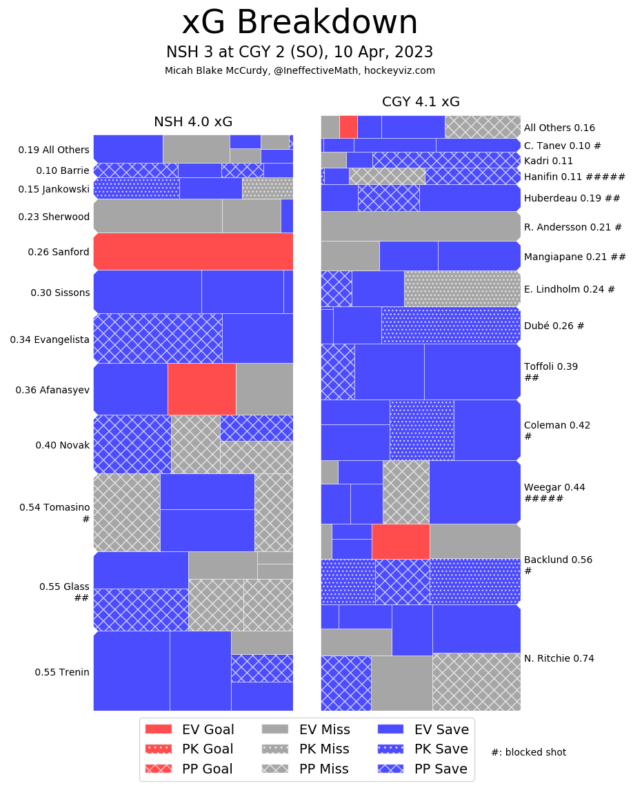 In The Crease – I will not roast him for the goal that went off a referee who was somewhere he should never have been. Unfortunately, that is just the reality of the game we love. The first goal against though – if the goaler is going to play the puck you have got to beat out the forecheck. If not, you have got to stay in your net and trust your defenceman. That goal ended up being the difference maker tonight that allowed Nashville to play with a lead. If that goal doesn’t happen maybe Calgary can play some stronger defence and limit high danger, chances a bit more instead of needing to be desperate for offence. 2.74 expected goals against with 2 high danger goals getting behind Markstrom.