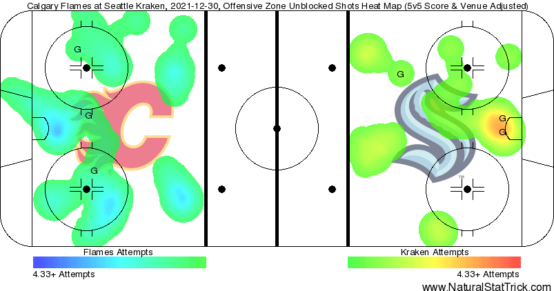 Seattle – that’s pretty bare. They were on the second half of a back-to-back, but even then the actual attacking performance wasn’t very good. Even on a night when they get all the bounces the Kraken still lose – good for Calgary (who deserved the W).