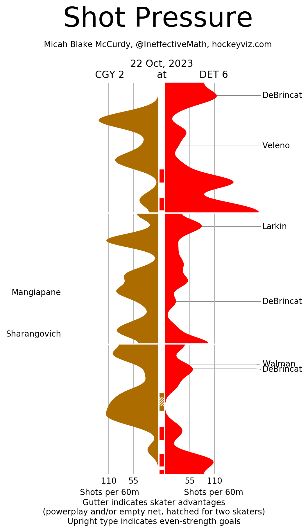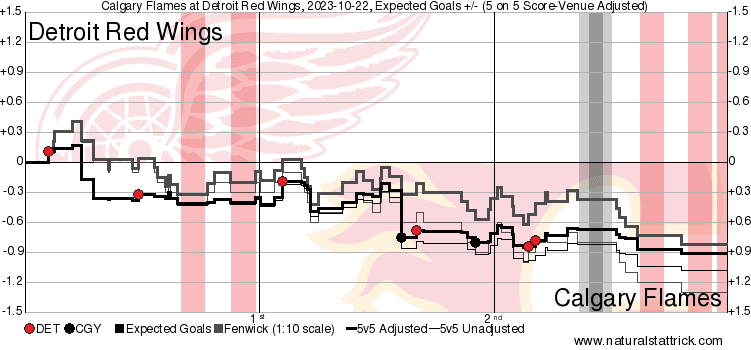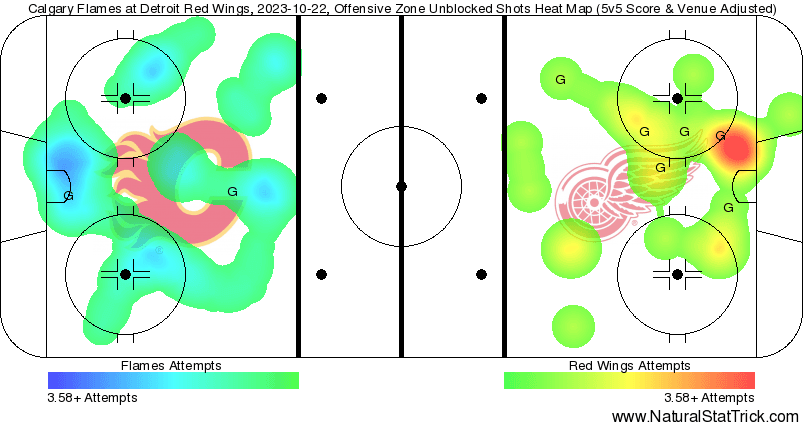 In The Crease – 1.34 expected goals against at 5v5 with one high danger, four medium danger, and one low danger goal getting behind Dan Vladar. Debrincat’s first goal is a blown defensive assignment, Larkin’s and Debrincat’s second came off terribly defended rushes, and the Veleno goal came off a deflection. I can accept those. Walman’s point shot and Debrincat’s third goal where he just snipes it need to be saved. One of those off the rush would have been nice to have your goaltender snag too. Not every defensive breakdown can end up in the back of your net and that happened to the Flames and Vladar Sunday afternoon.