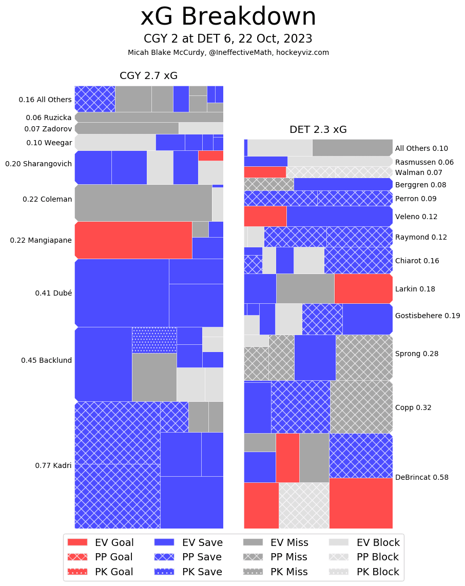 It’s a Team Game – As much as people want to look at the final score and jump to a conclusion that the Flames “suck,” that would be a way too early over-correction to a short-term result. Keep your heads on – the sky won’t fall forever chicken little. In fact if this game is simulated 100 times with these team metrics I would wager on the Flames coming out ahead more than the Red Wings. True shooting talent in the form of Alex Debrincat really destroyed them – more than the goaltending (which was not good) or the team play in front of the goalie (which was quite good). The metrics could have been even more skewed, but the Flames trailing off in the last 10 minutes of a blowout to end a 5-game road trip is completely understandable.