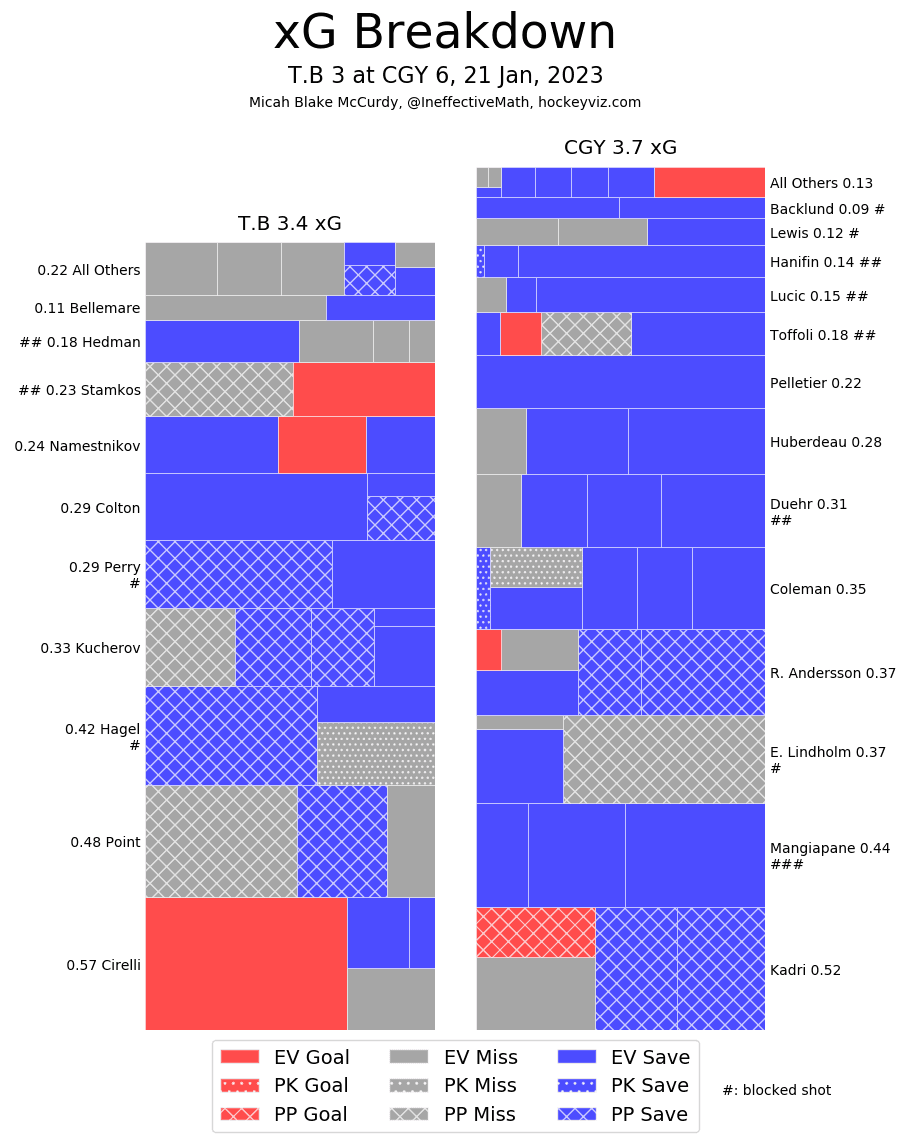 Taken By Chance – Not really anyone that I would outright grade as disappointing in this facet. Tampa hardly got close to Vladar and as such not many chances were dangerous. Add in that Calgary had the puck over 65% of the time and you’ll see that Tampa really struggled. Calgary kind of took it to them and they couldn’t stop it. The shoutout for this section goes to Rasmus Andersson (64.67 SCF% // 88.95 HDCF%) who was involved in over 8 high danger chances to lead the team. Mikael Backlund (60.41% // 86.36%) led the way for forwards being involved in 7 high danger looks.