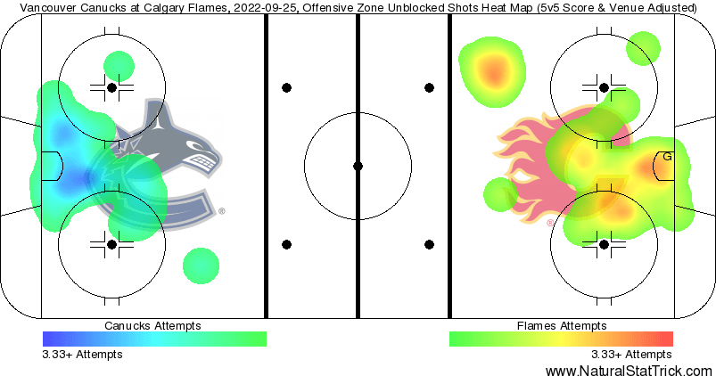 Similar to the first game from Vancouver both teams really prioritized getting to the crease for attempts. The Canucks were all over Dan Vladar to start this game and then the Flames defenders kicked in and limited chances fairly well. Early season things to work on, but that’s why they play the games folks. More 5v5 time going forward would be more helpful for everyday evaluation – we’ll see what happens this week.