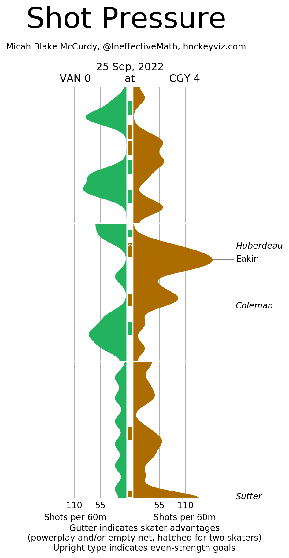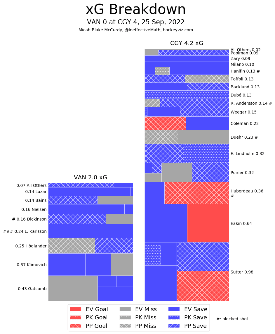 Corsi King – Rasmus Andersson (78.88 CF%) gets the top spot in this one – second overall in 5v5 attempts for (9.83 at 5v5 SVA). Jeremie Poirier (52.02%) had the most attempts (10.21), but also saw a heavy amount come back his way (9.42 against). Veterans Blake Coleman (75.88%), Mikael Backlund (75.88%), Noah Hanifin (73.53%) all finished against the Canucks road squad with great numbers.