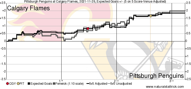 It’s a Team Game – It was all Flames from puck drop, especially the top line. The team finished the first with an xGF% of 72.07%. It went throughout the whole game, and especially in the third where they had all the high danger opportunities to themselves (4-0 in CGY favour). All being said the Penguins got lucky too, Johnny Gaudreau hit iron twice in game before finally beating Jarry in the shootout. Penguins were lucky they got a point, and they owe that all to their goaltender.