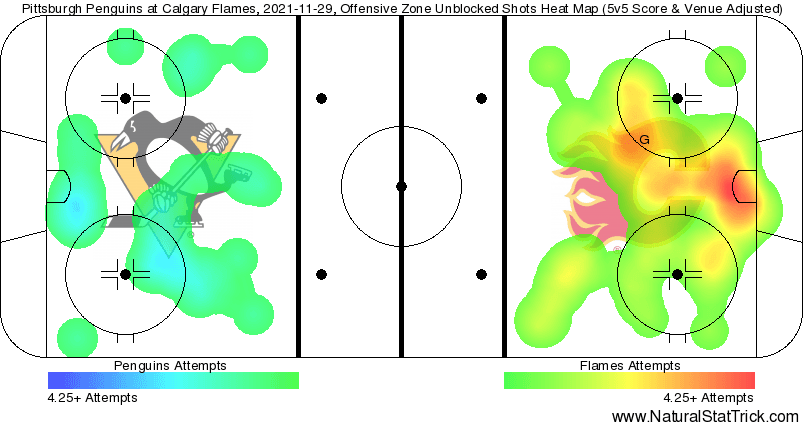In The Crease – Markstrom wasn’t overworked at 5v5 in this game, facing only 2 high danger chances in 57:52 of 5v5 play. 0.94 expected goals against with a 1.00 SV%. The Penguins lone powerplay goal was off a deflection, Markstrom was just once again solid all-around. Had the penalty not get called it would have been highly probable he was cruising to another shutout.
