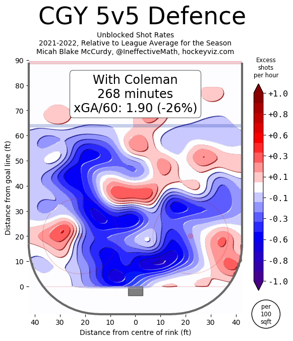Game Score – Like it was discussed in the intro – by game score metrics not a single player achieved a negative defensive impact. The lowest skater by Flames Game Score was the guy with the hardest matchup – Mikael Backlund (0.20 game // 0.59 average). He just went head-to-head with one of the top players in the league at 5v5 and matched him step for step. Top three were Oliver Kylington (2.41 // 1.16), Chris Tanev (2.20 // 0.75), and Noah Hanifin (1.92 // 1.07).