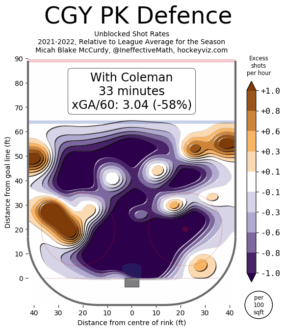 Taken By Chance – Not a single player gave up more high danger chances than they created. Three players endued up neutral, meaning they allowed as many chances as they created: Milan Lucic, Trevor Lewis, Mikael Backlund. The Flames snakebitten third line played solid with Sean Monahan (88.04 SCF% // 100 HDCF%), Dillon Dubé (88.04% // 100%), and Tyler Pitlick (88.04% // 100%) all finished without allowing a high danger chance again while creating 3 themselves. Rasmus Andersson (70.54% // 73.28%) and Noah Hanifin (68.85% // 73.28%) were back on some strong play again themselves with 6 high danger chances coming while those two were on the ice.