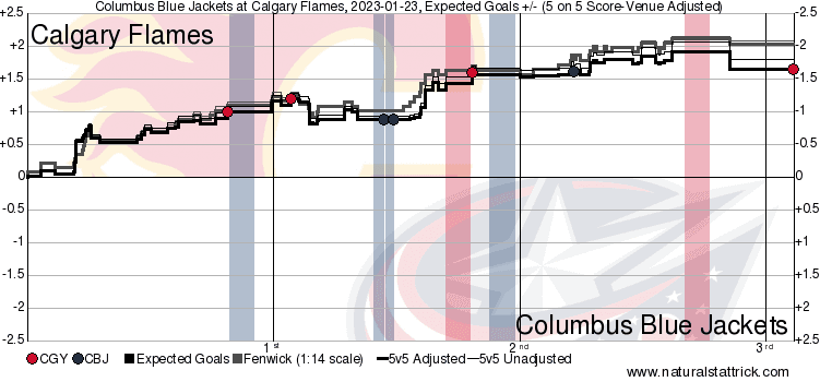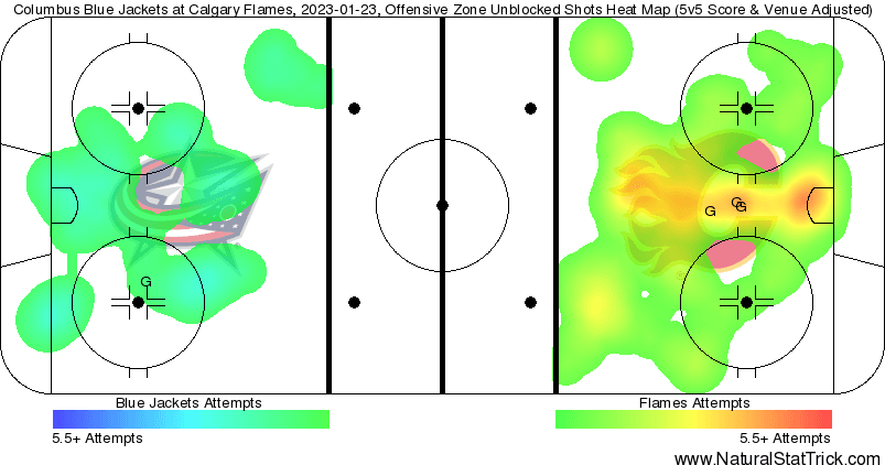 Corsi King – Nazem Kadri (83.20%) had his legs going early using his speed to get on the forecheck and cause turnovers. His linemates Huberdeau (75.11%) and Lucic (81.03%) also created noticeable offensive zone turnovers. Blake Coleman (81.30%) was the other player to finish with over 80% of the shot attempt share. Everyone on Calgary pretty much was as they fired everything, they could towards the Columbus net.