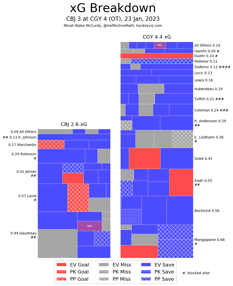 Corsi Clown – Only 1 person was below 50%, and even then, it wasn’t bad at all. Dillon Dubé (48.34%) was good with his speed on the breakout tonight and always made the safe/right play. I got no quarrels with what he did – that line just got hemmed in the few times the opposition created 5v5 chances.