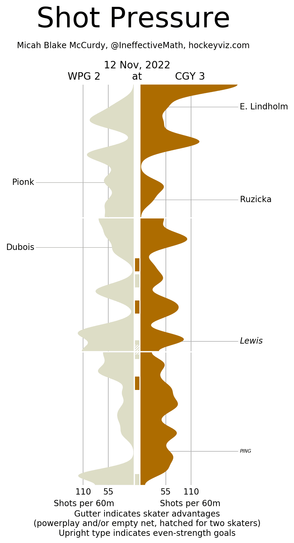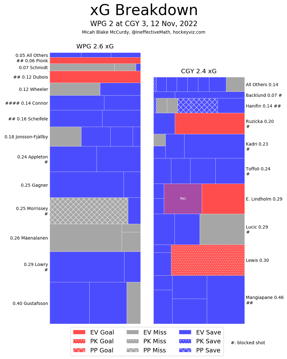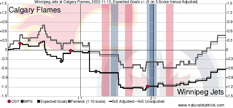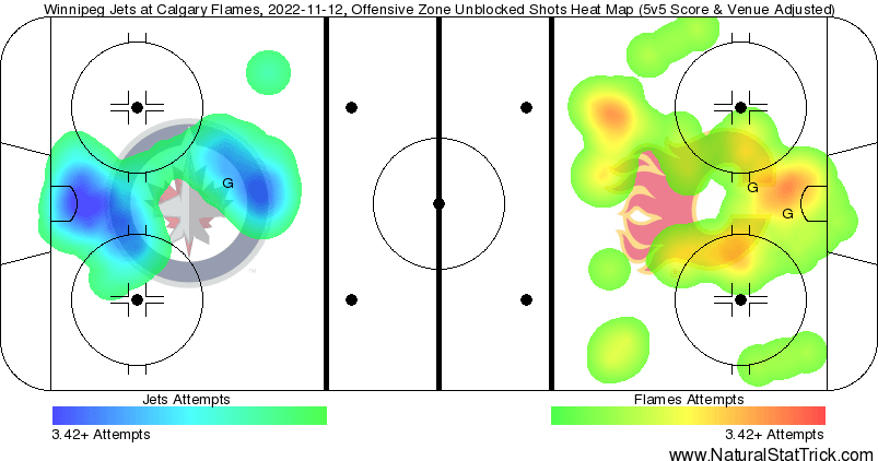 I’m surprised Kyle Connor didn’t score – the Flames were just giving him prime looks in the first and second period. You can tell which ones are his by the long lines in the direction of the Jets momentum.