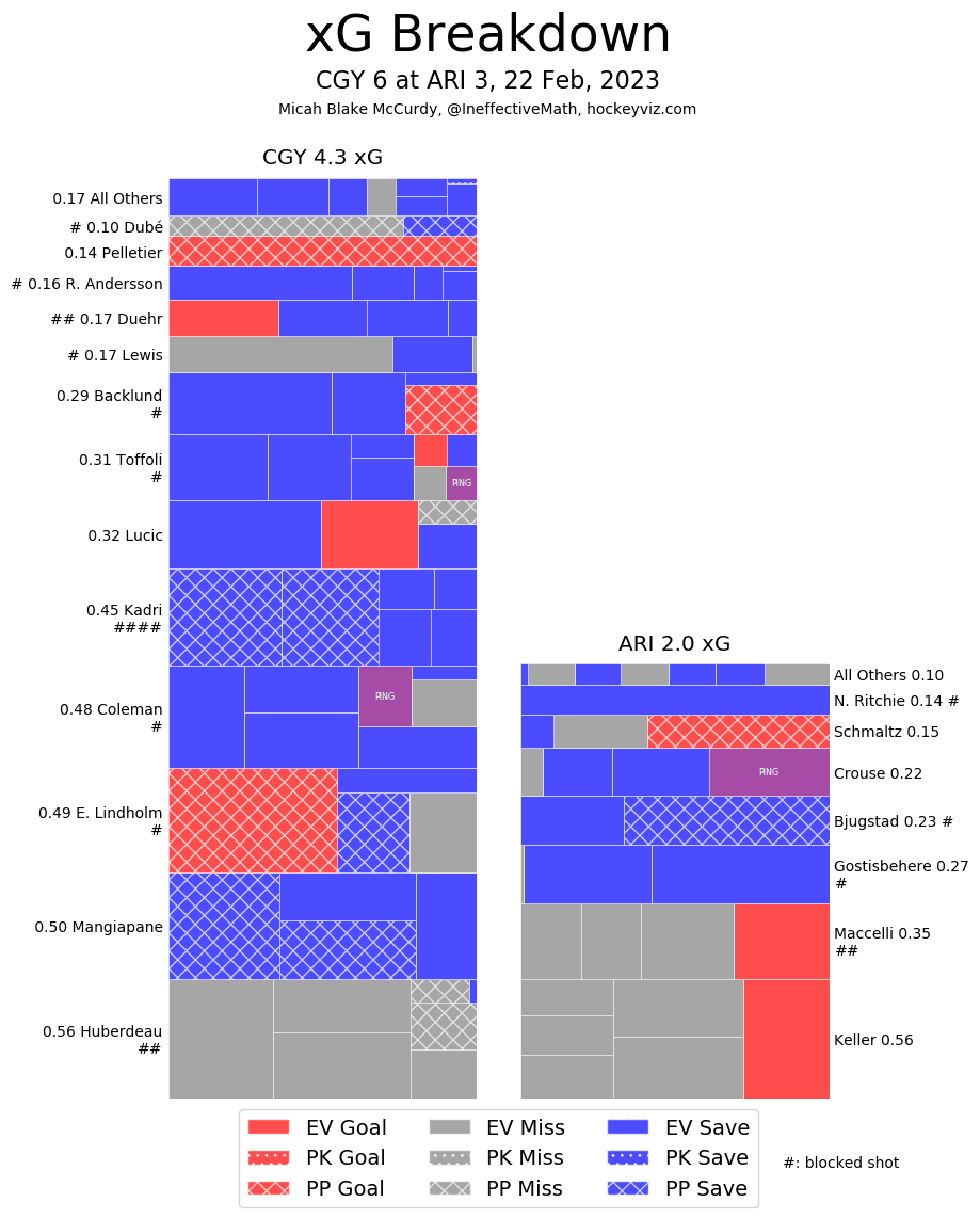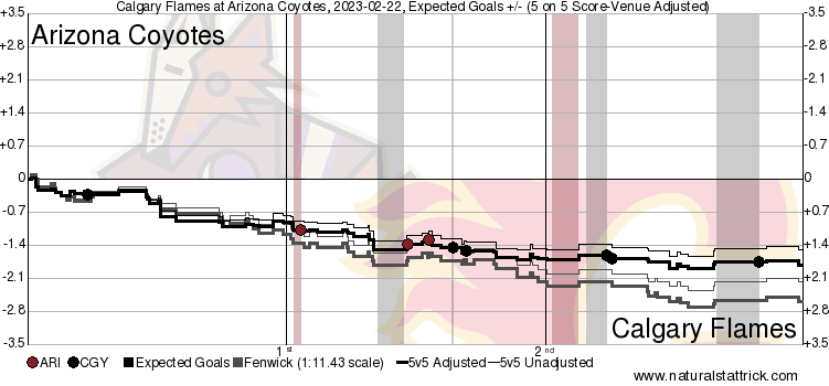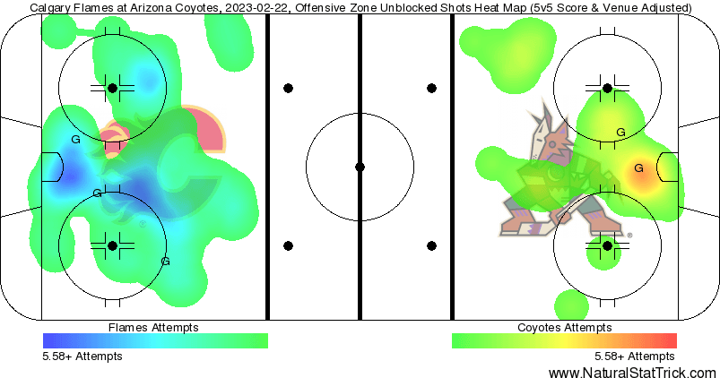 Corsi King – Mikael Backlund (84.65%) continues to feast upon any team that is in the Bedard sweepstakes. It’s not even particularly close in terms of match-up quality. Weegar (77.61%) and Tanev (76.30%) have had their fair share as the top two defenceman here, but this is the first time playing on separate pairings. A tremendous sign as the Flames top 4 excelled in this match. The entire roster finished on the positive side of the shot attempt battle – something you could sense brewing as early as the first period. The Coyotes had points going in 9 straight games before the game against the Flames, taking care of business to this level against them was what you like to see in terms of compete level. Great stuff all around.