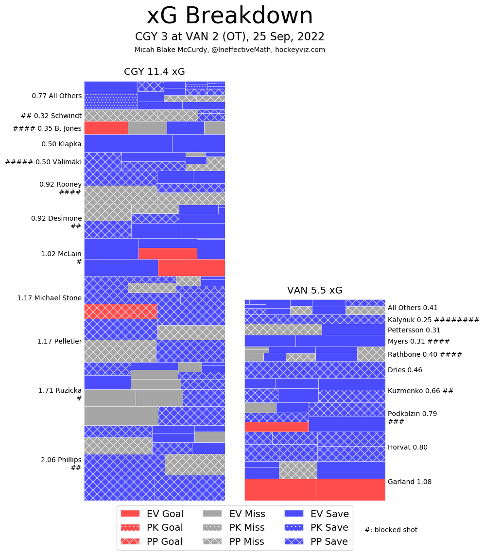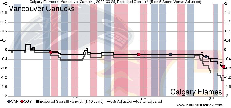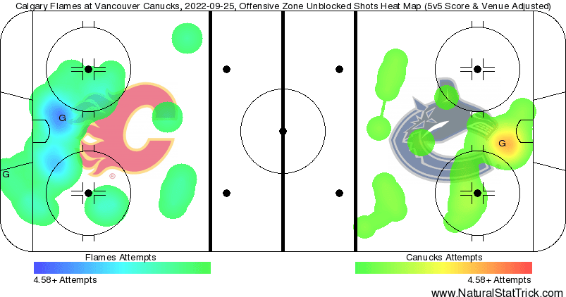Corsi King – Two players succeeded in not seeing a shot even attempted against them – Ben Jones (100 CF%) and Juuso Valimaki (100%). Jakob Pelletier (81.90%) led the team in corsi-events for tonight with 8.41 attempts (5v5 SVA), with Matthew Phillips (80.06%) right behind him with 7.46 attempts. Adam Ružička (62.42%) and Nick DeSimone (51.77%) were the other Flames to hold their own in the attempt battle.