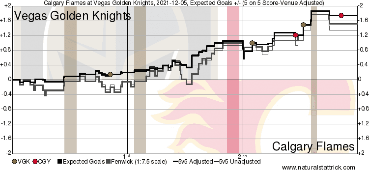 It’s a Team Game – The worst high danger ratio of the year for the Flames as an overall unit. High Danger chances through two were 7-0 in favour of Vegas. They really did defend well, the defence for Vegas in particular were able to stifle all of the Flames 5v5 offence. They have big names over there, but guys like Zach Whitecloud and Nicholas Hague are very solid defenders in support – if they’re on their game getting anything against Vegas is going to be difficult.