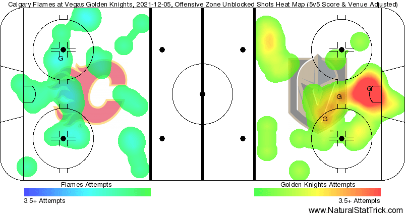 The Flames worst overall heatmap this season by a landslide. Normally their offensive map looks like Vegas’, with a large number of chances in and around the oppositions goal mouth. Vegas was excellent in defending, moreso than Calgary was at attacking. The fact that it was only a 1-goal game is the surprise, Vegas could have won by more.