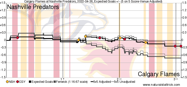 It was a penalty filled affair between two playoff bound teams, Calgary and Nashville, which typically translates directly into a lack of 5v5 play. Hard to get in a positive groove if you can’t roll your lines like you normally do. Calgary finally got some extended 5v5 time and were able to gain momentum on the Predators. The momentum brought more physical play and eventually more penalties. Throw in that miraculous sequence to tie the game with 0.1 seconds left and everyone was properly rewarded for their hard work. Slim down on the retaliation when the games count though, please.