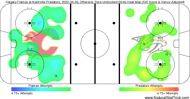Corsi King – Matthew Tkachuk (72.21 CF%) led the way in terms of all chances, and why wouldn’t he. Tkachuk seems to be Mr. Nashville for this franchise – continues to steal games from them in heartbreaking yet spectacular fashion. Noah Hanifin (69.12%) and Rasmus Andersson (64.41%) were play drivers all night long.